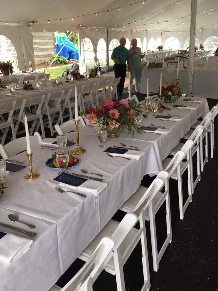 • 8' Banquet Table 20' x 30' Pole Tent with Blue Stripe, 8' Banquet Tables, 48" Round Tables, White Steel/Plastic Fanback Chairs. 40' x 80' Pole Tent, White Padded Chairs, 8' Banquet Tables with White Linens, Cathedral Side Panels, Tent Lights. 40' x 100' Pole Tent, Wooden Chairs, 8' Banquet Tables, Tent Lights, Solid Side Panels. Natural Wood Chairs, 8' Banquet Tables, Plastic Kwik Covers - 8' Banquet. 8' Banquet Tables, White Padded Chairs. 8' Banquet Tables, Linens.