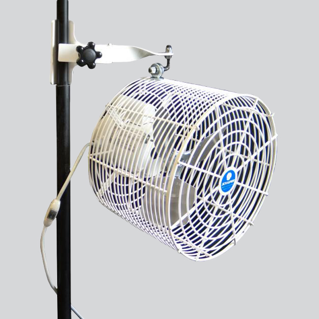 Twelve inch fan that easily clamps onto almost any pole in a frame or pole tent.