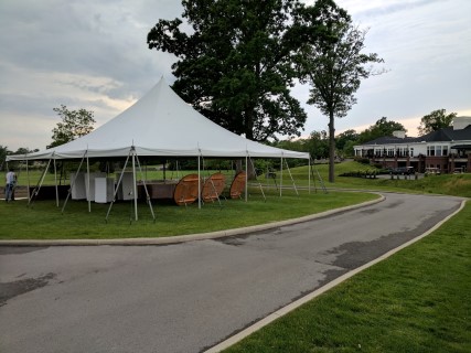 • 40' x 100' Pole Tent, Riser Staging. 60" Round Tables, White Plastic Chairs, Riser Staging, PA System with Podium. Local band performing on riser staging